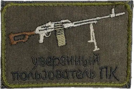 The text on the patch reads “Уверенный пользователь ПК.” Translated into English, it means “Confident PC user.” In everyday Russian usage, this phrase is commonly associated with a skilled computer user or IT specialist. In this patch context, the phrase plays on the dual meaning of “ПК,” implying proficiency with the Kalashnikov machine gun rather than a computer. The wording functions as a visual joke based on shared cultural and linguistic understanding.