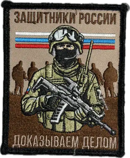 The Russian text on the patch reads “Защитники России” and “Доказываем делом.” Translated into English, these phrases mean “Defenders of Russia” and “We prove it by deeds.” The wording functions as a declarative slogan emphasizing action and commitment. In this context, the text serves as symbolic messaging rather than an operational instruction or organizational designation.