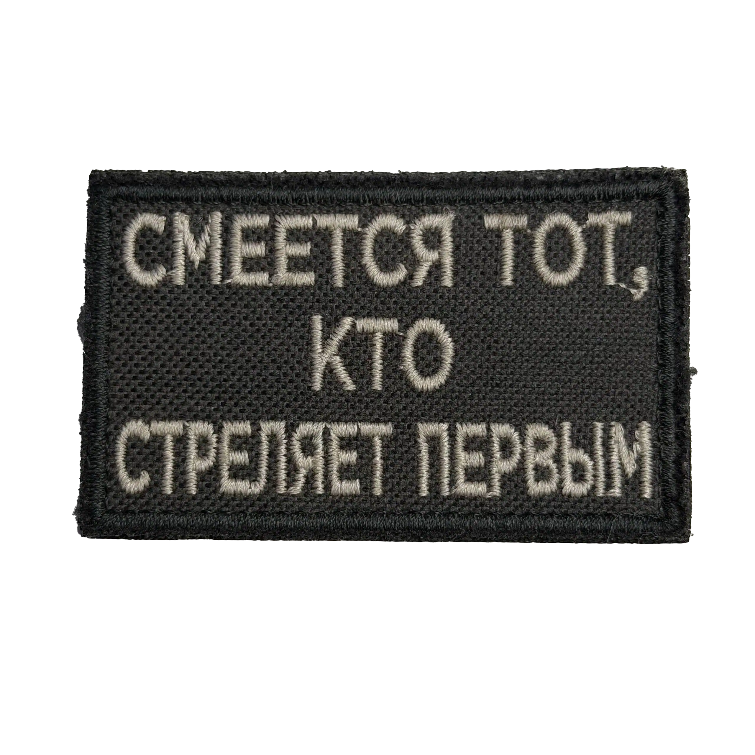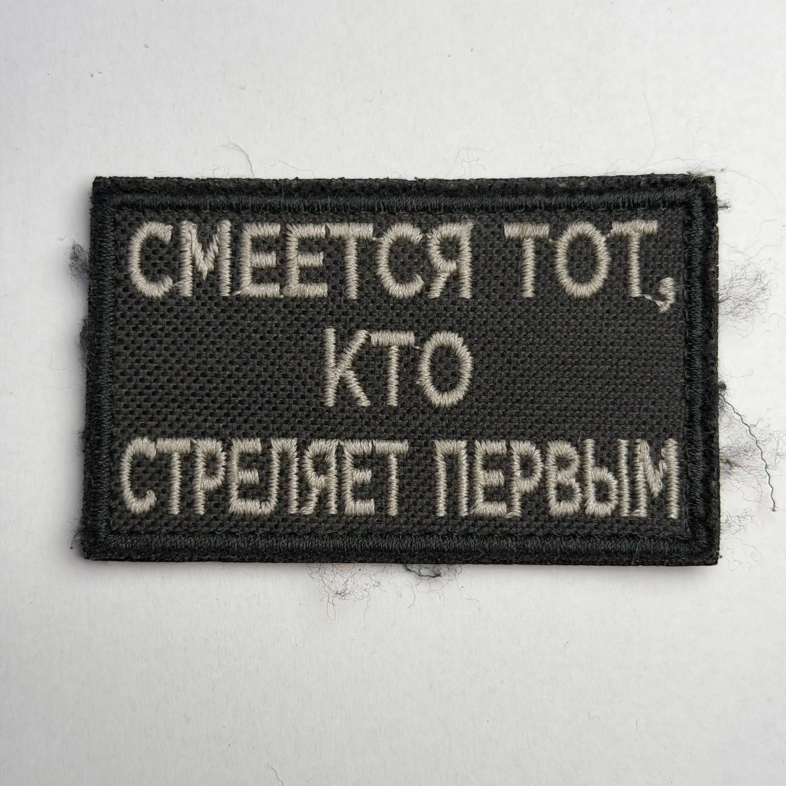 The Russian Trophy Patch Laughs First Shoots First is a rectangular black field patch with white embroidered Cyrillic text reading “Смеется тот, кто стреляет первым.” Translated into English, the phrase means “He laughs who shoots first.” The slogan reflects an aggressive combat mindset commonly seen in informal frontline insignia.