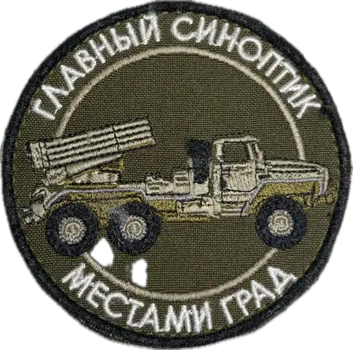is a unique collectible emblem inspired by Russian multiple launch rocket systems. The patch features the phrase “Chief Meteorologist” and the word GRAD, a playful reference that works both as the weather phenomenon and the iconic artillery system, making it a clever and memorable design.