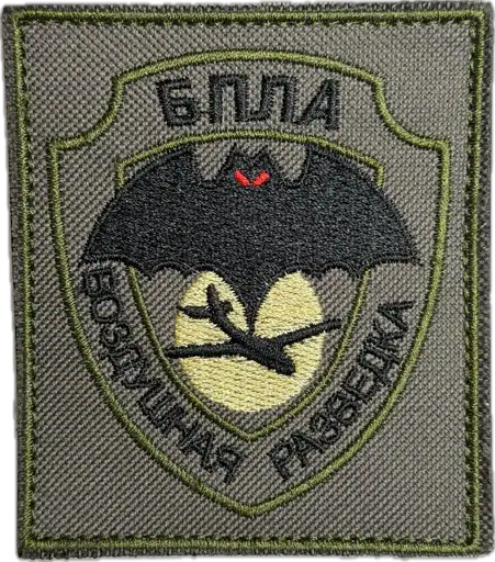 The Russian text on the patch includes “БПЛА” and “Военная разведка.” Translated into English, these phrases mean “UAV” (Unmanned Aerial Vehicle) and “Military Reconnaissance.” The wording functions as a role descriptor indicating reconnaissance activity conducted with unmanned systems rather than a specific unit designation.