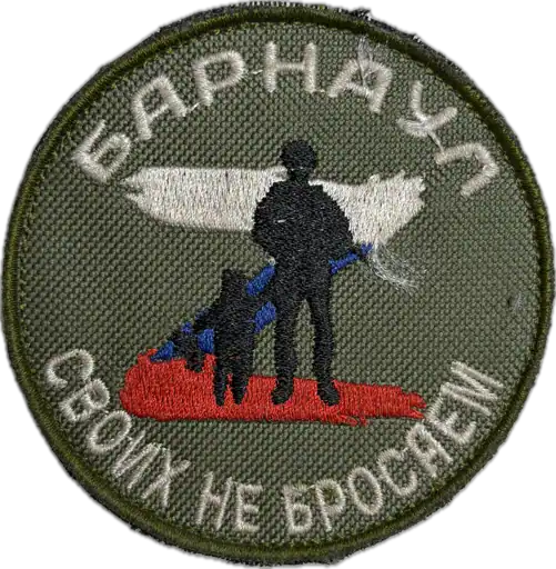 The Russian text on the patch reads “Барнаул” and “Своих не бросаем.” Translated into English, these phrases mean “Barnaul” and “We do not abandon our own.” In this context, the wording functions as a solidarity slogan emphasizing mutual support and responsibility, commonly used in volunteer and aid-related messaging rather than as a unit designation or operational statement.