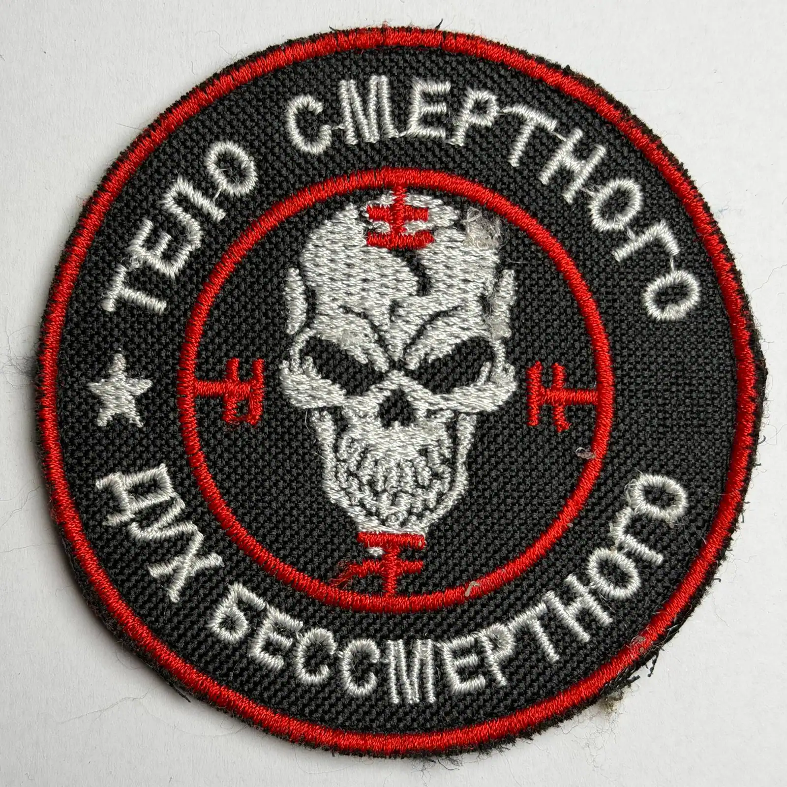 The outer ring of the patch contains a Cyrillic slogan reading “ТЕЛО СМЕРТНО, ДУХ БЕССМЕРТЕН.” The text translates into English as “The body is mortal, the spirit is immortal.” The phrase is used as a motivational statement and does not indicate unit designation, rank, or official affiliation.