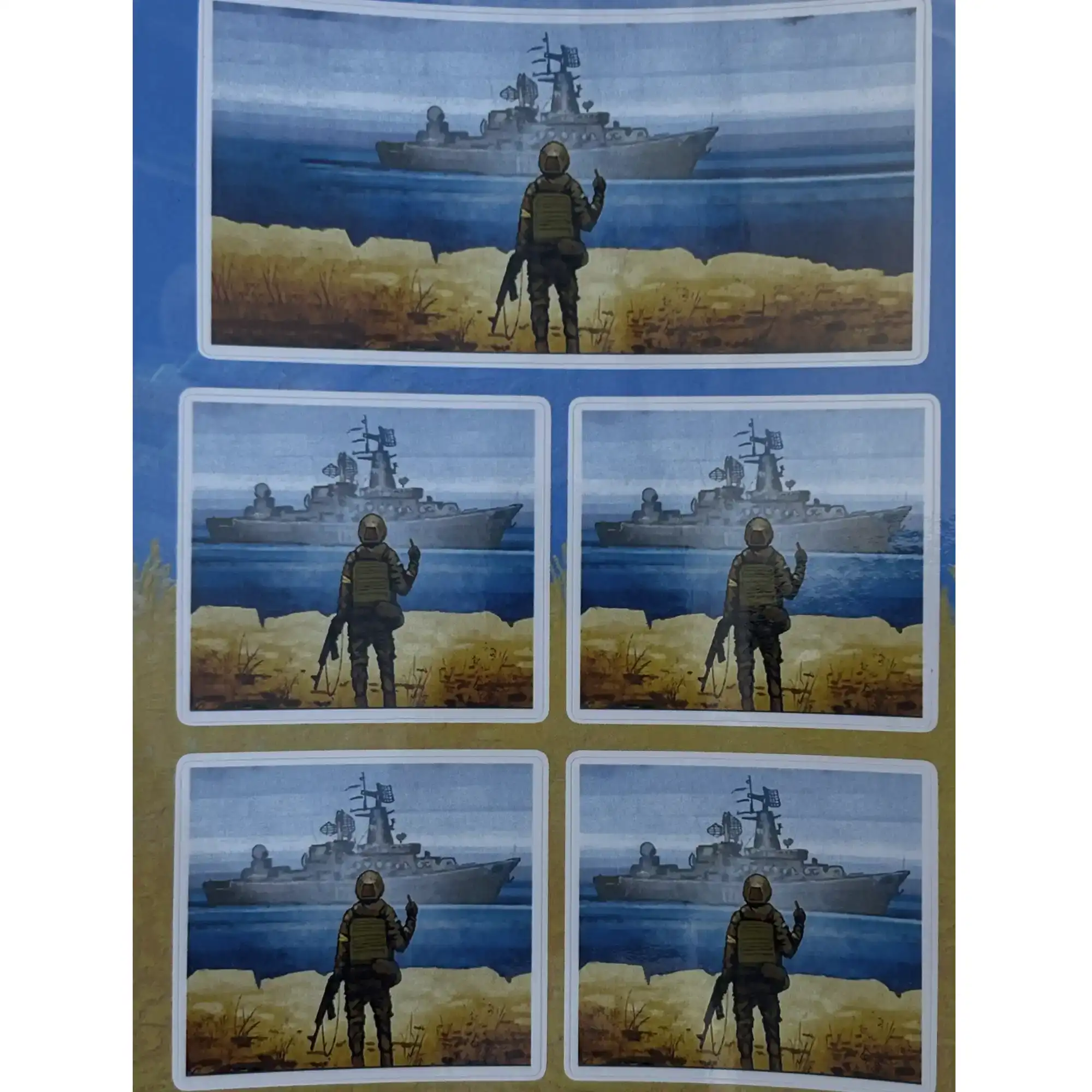 Each sticker features the confrontation on Snake Island between the Ukrainian border guard and the Russian navy ship. The scene became a popular military collectible and symbol of Ukrainian resistance. Stickers are made for those who follow military history and support Ukraine.