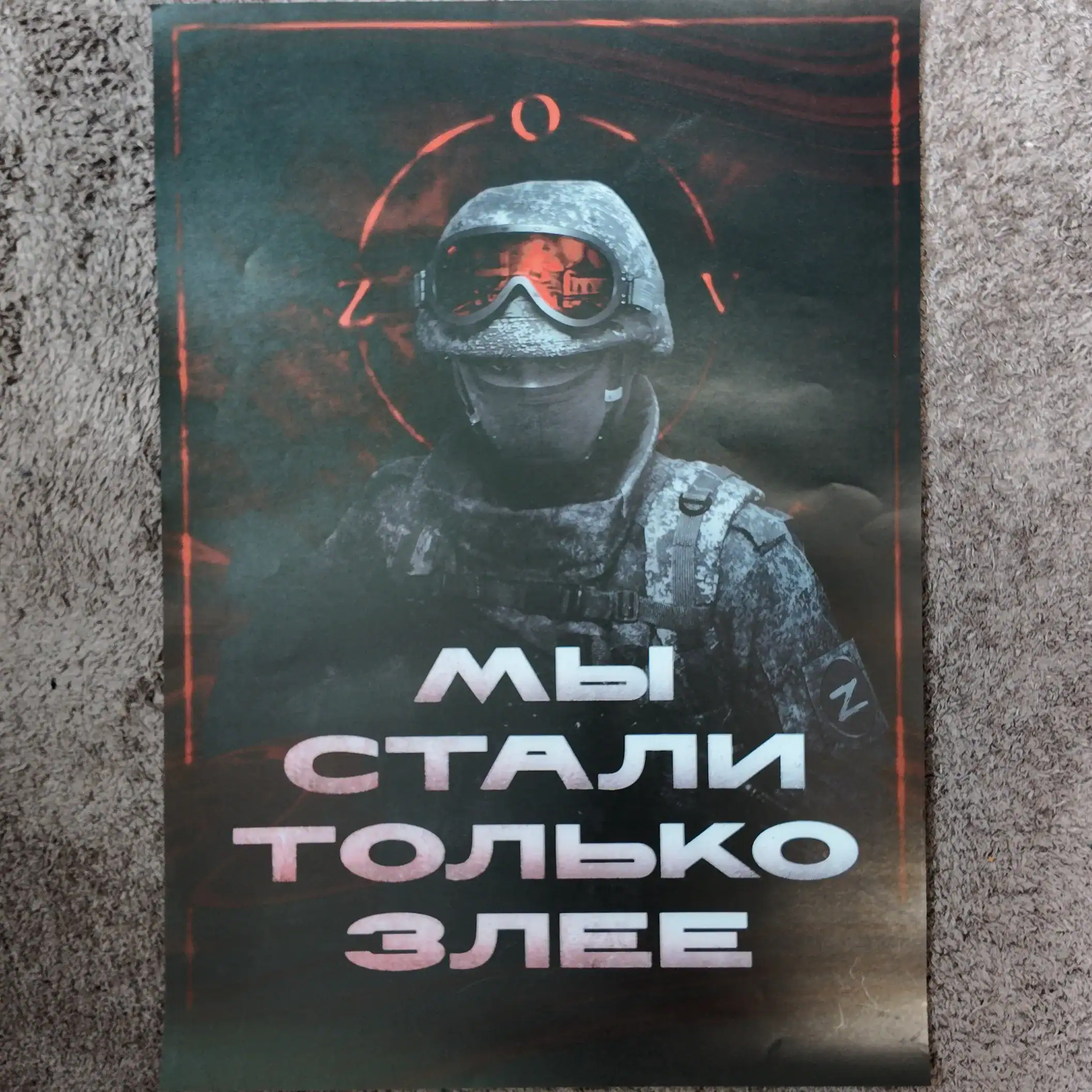 The Russian We Became Only Angrier Poster 60x40cm features a striking visual of a modern Russian soldier, instantly recognizable by the combat gear and Z arm patch. This image, paired with the phrase “Мы стали только злее,” communicates a message of unwavering resilience and unity.