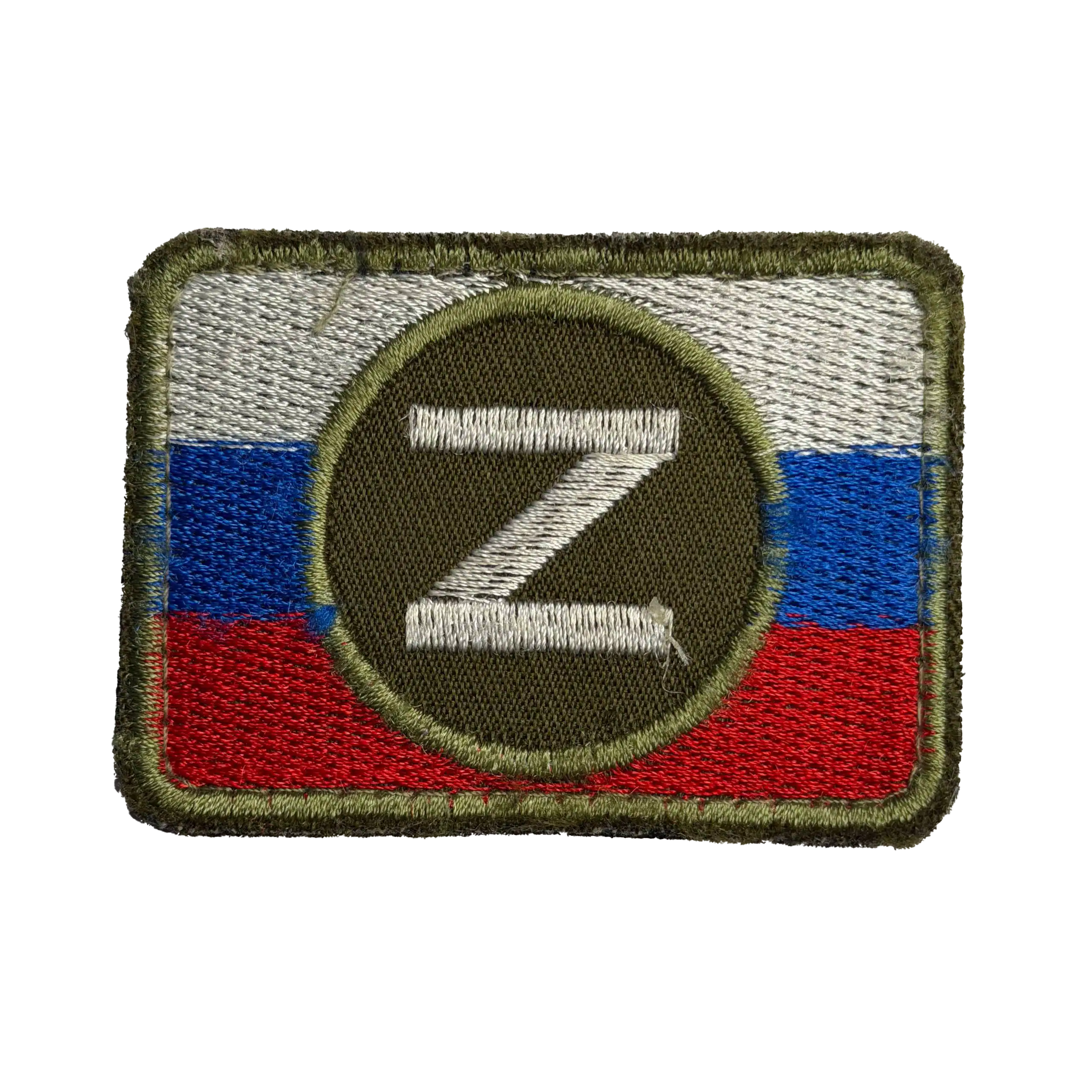 Russian Z on Flag Trophy Patch embroidered on a rectangular textile base with rounded corners and stitched olive border. The background reproduces a horizontal tricolor flag pattern in white, blue, and red thread. At the center is a circular olive field containing a large white embroidered Latin letter “Z,” stitched in a simple block form.