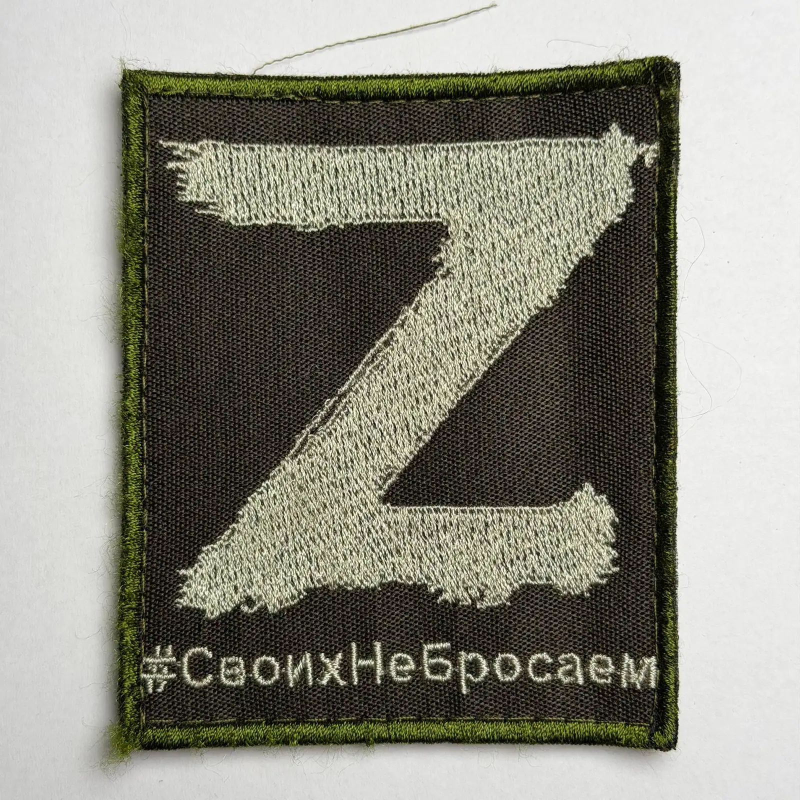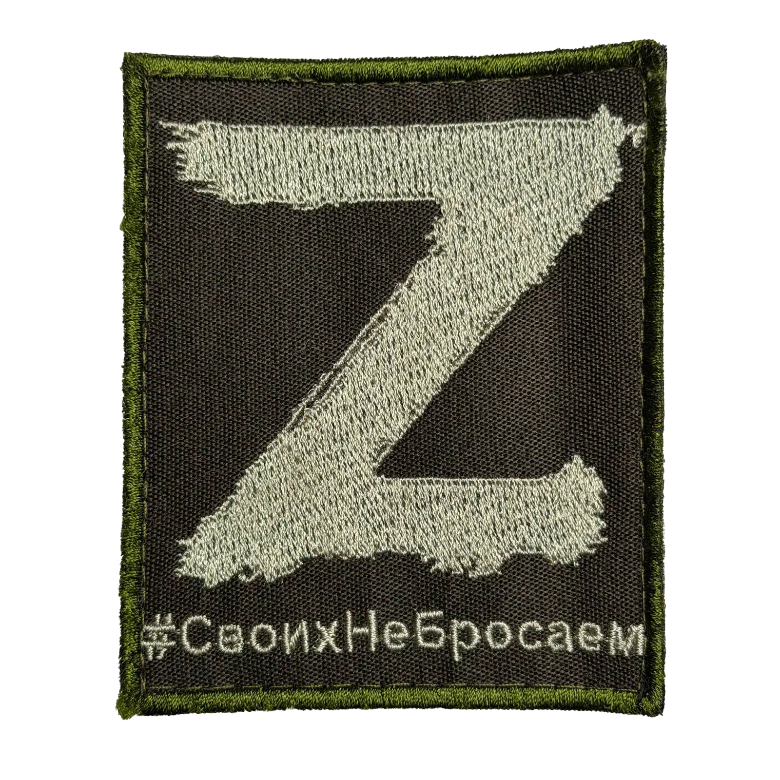 Along the lower edge, the patch features the Cyrillic hashtag “#СвоихНеБросаем.” Translated into English, the phrase means “We do not abandon our own.” The text functions as a slogan-style message and does not indicate any formal unit affiliation, rank, or official designation.