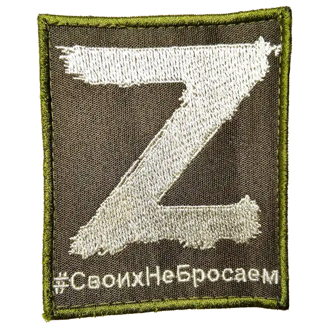 The Russian ZOV Patriotic Slogan Patch 9×7.5cm is a rectangular military insignia with the embroidered Z symbol and the motto “Своих не бросаем” (We Don’t Abandon Our Own). Produced on a camouflage background with green border stitching, this patch became one of the most visible identifiers of Russian forces.