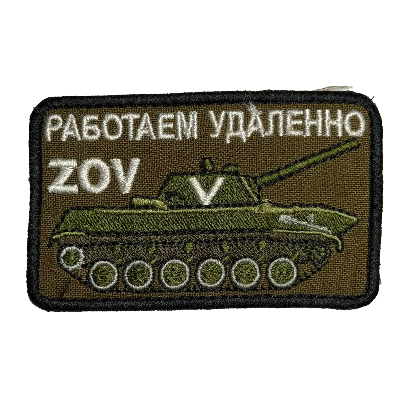 Russian ZOV Remote Work Trophy Patch featuring an embroidered BMD airborne armored vehicle on olive textile backing. The upper part of the patch displays Cyrillic text reading “РАБОТАЕМ УДАЛЕННО,” with “ZOV” placed below, integrated into the overall composition. A white “V” marking is embroidered on the turret of the vehicle, serving as a visual identifier within modern conflict-related patch design.