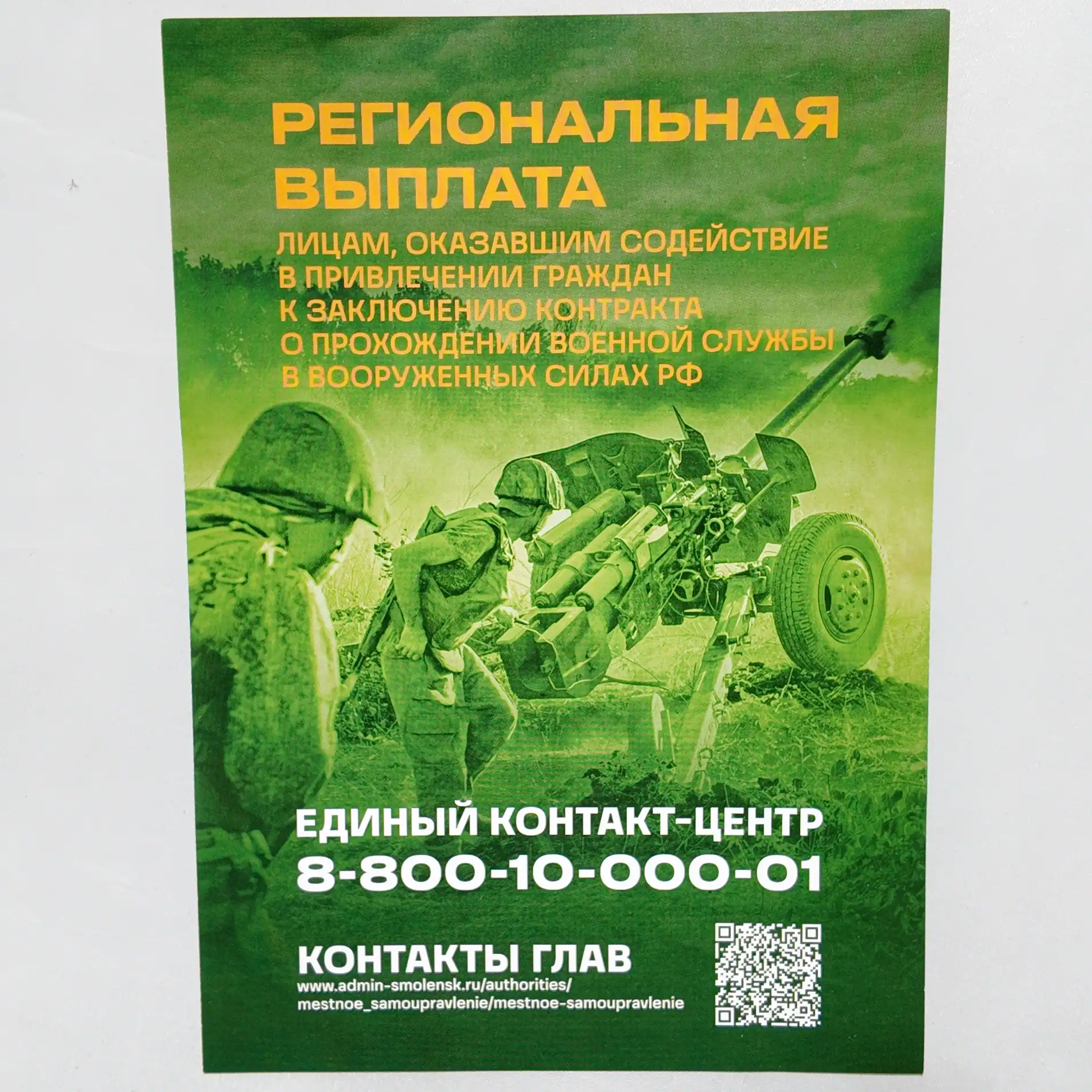 The headline — “Regional Payment for Assisting Military Contract Signing” — was designed to motivate civilian involvement in recruitment efforts. Like many other Russian military posters produced during the conflict, this one frames enlistment as honorable and rewarding.