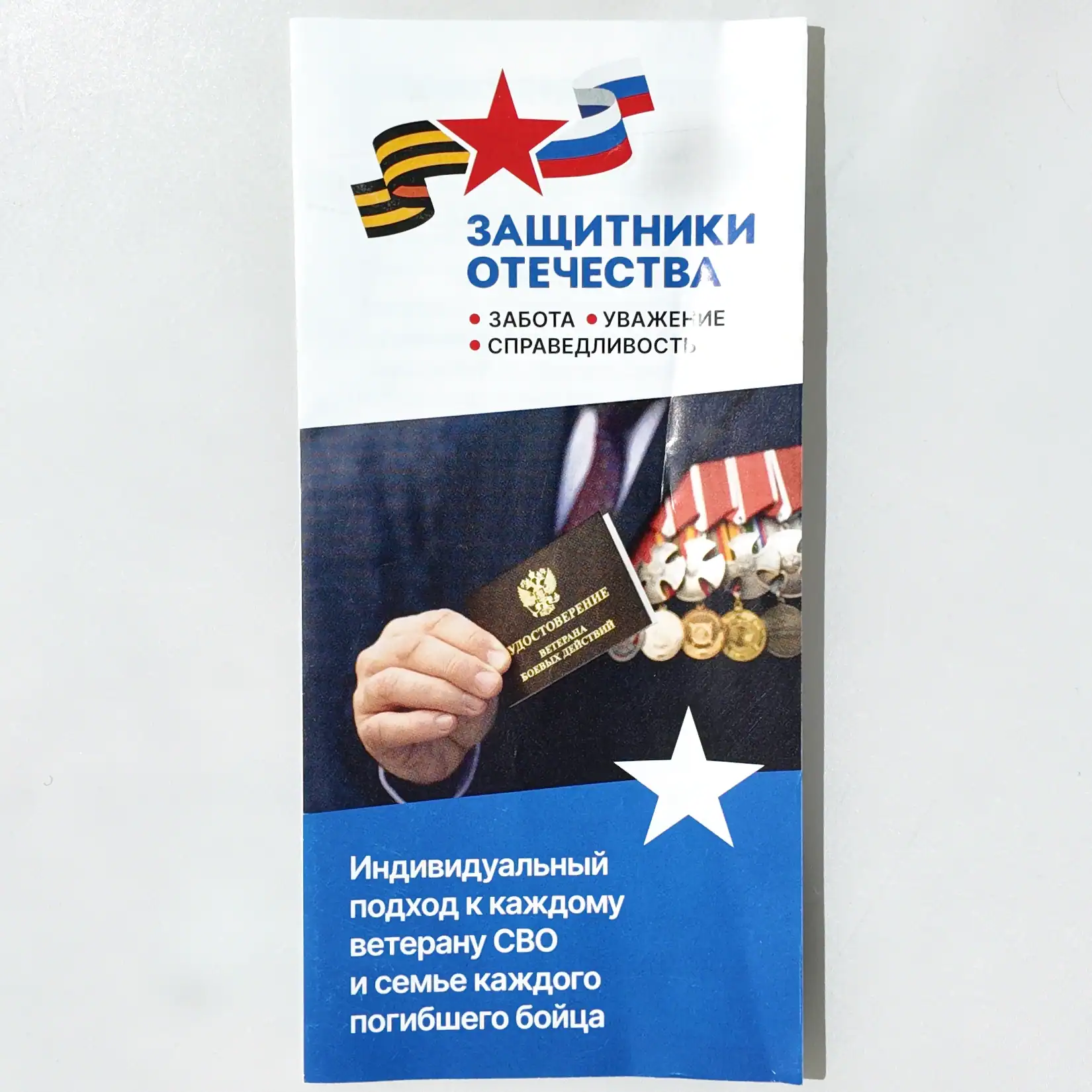 This propaganda artifact promoting social aid to veterans of the Ukraine war. Issued by the Defenders of the Fatherland Foundation, it documents psychological operations and post-war reintegration efforts during the SMO.