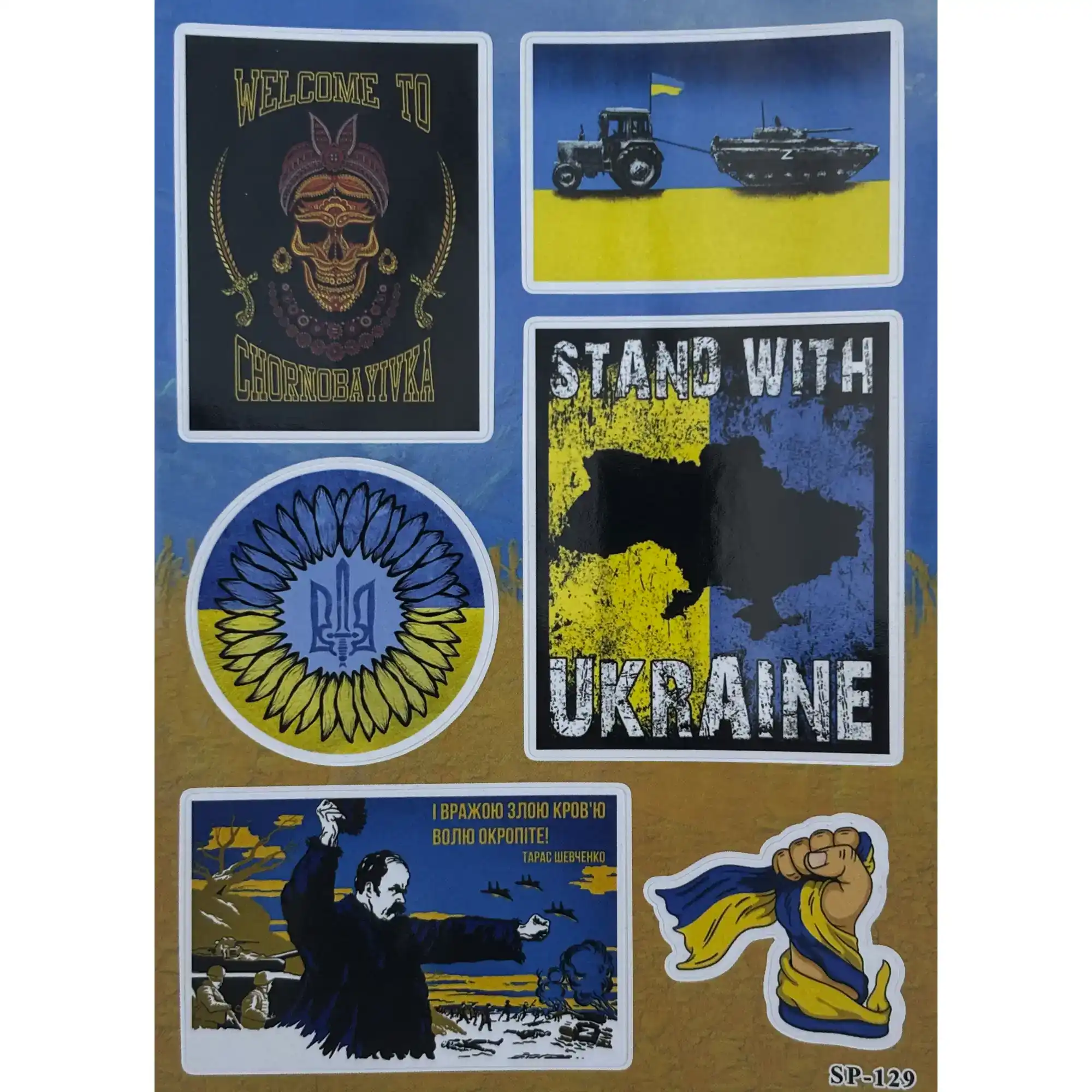 6 unique stickers: Includes Stand With Ukraine, Ukrainian tractor, Trident, Chornobaivka, flag, fist, and Zelensky illustration.