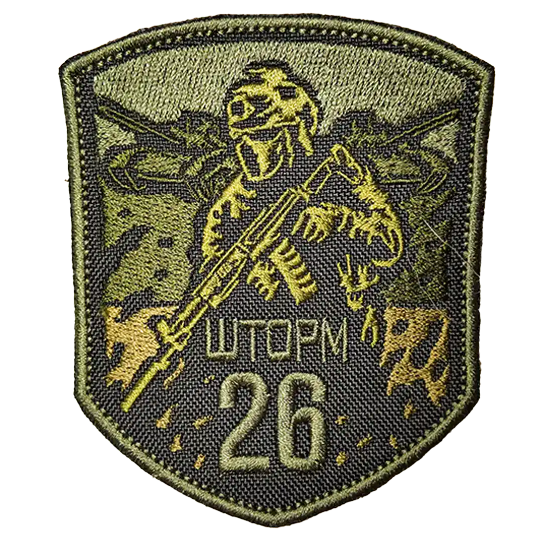 The Storm Squad 26 Patch measures 9,5×7,5 cm and is an embroidered Russian military insignia. The design shows a soldier in full gear holding a rifle, with detailed stitching outlining the weapon and equipment. Below the figure, the text reads “Шторм 26,” directly identifying the unit as Storm Squad 26.