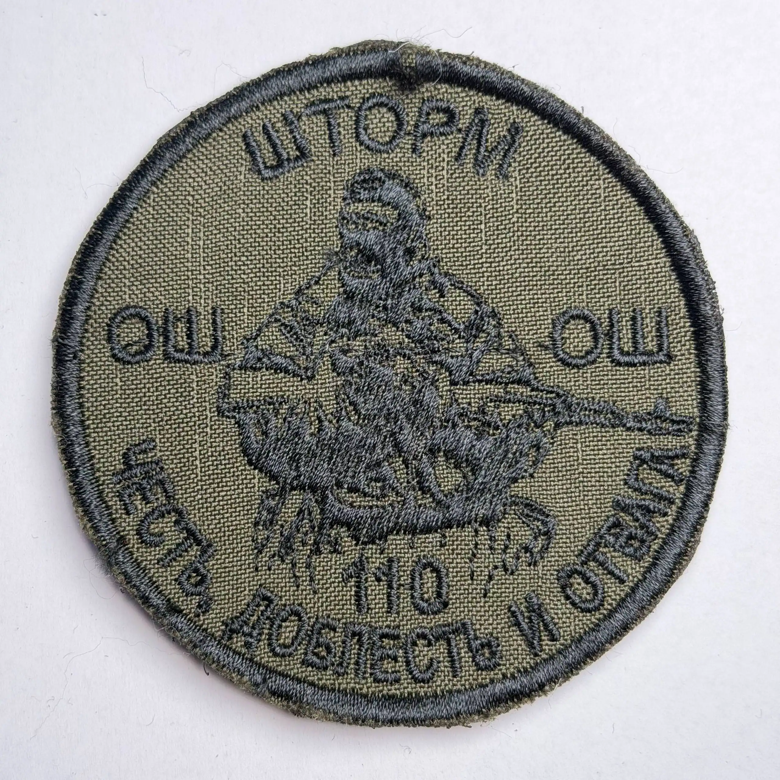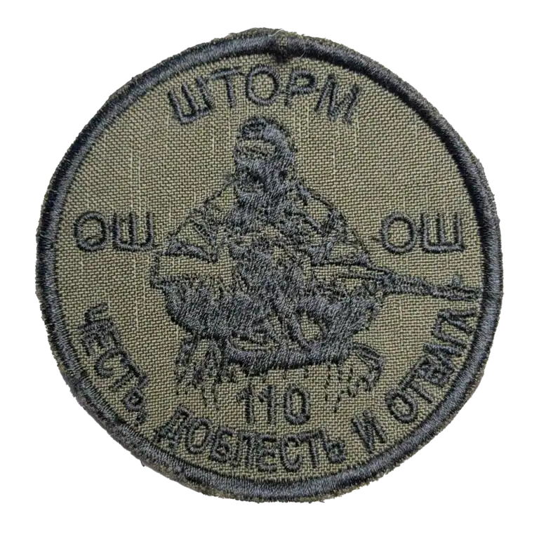 The Storm Z 110 Honor Courage and Valor Trophy Patch is a circular embroidered insignia featuring a combat figure and the Cyrillic text reading “ШТОРМ Z 110 ЧЕСТЬ, ДОБЛЕСТЬ И ОТВАГА,” which translates to “Storm Z 110 Honor, Courage and Valor.” The design reflects frontline symbolism with a focus on aggressive identity and unit pride.