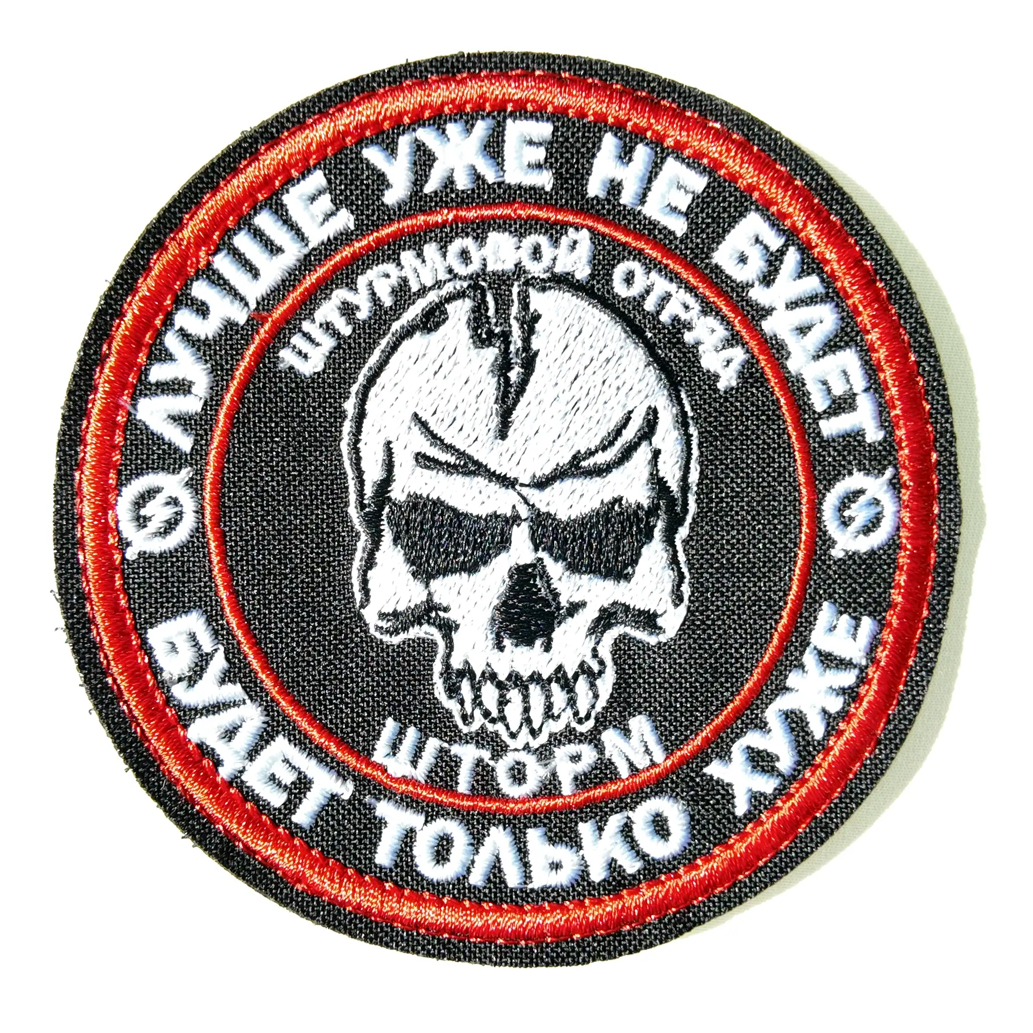 This 8cm embroidered patch represents a Russian Storm Z assault detachment, known for its frontline role in Ukraine as part of the Special Military Operation (SMO). The patch features a skull with lightning bolt and inscriptions: