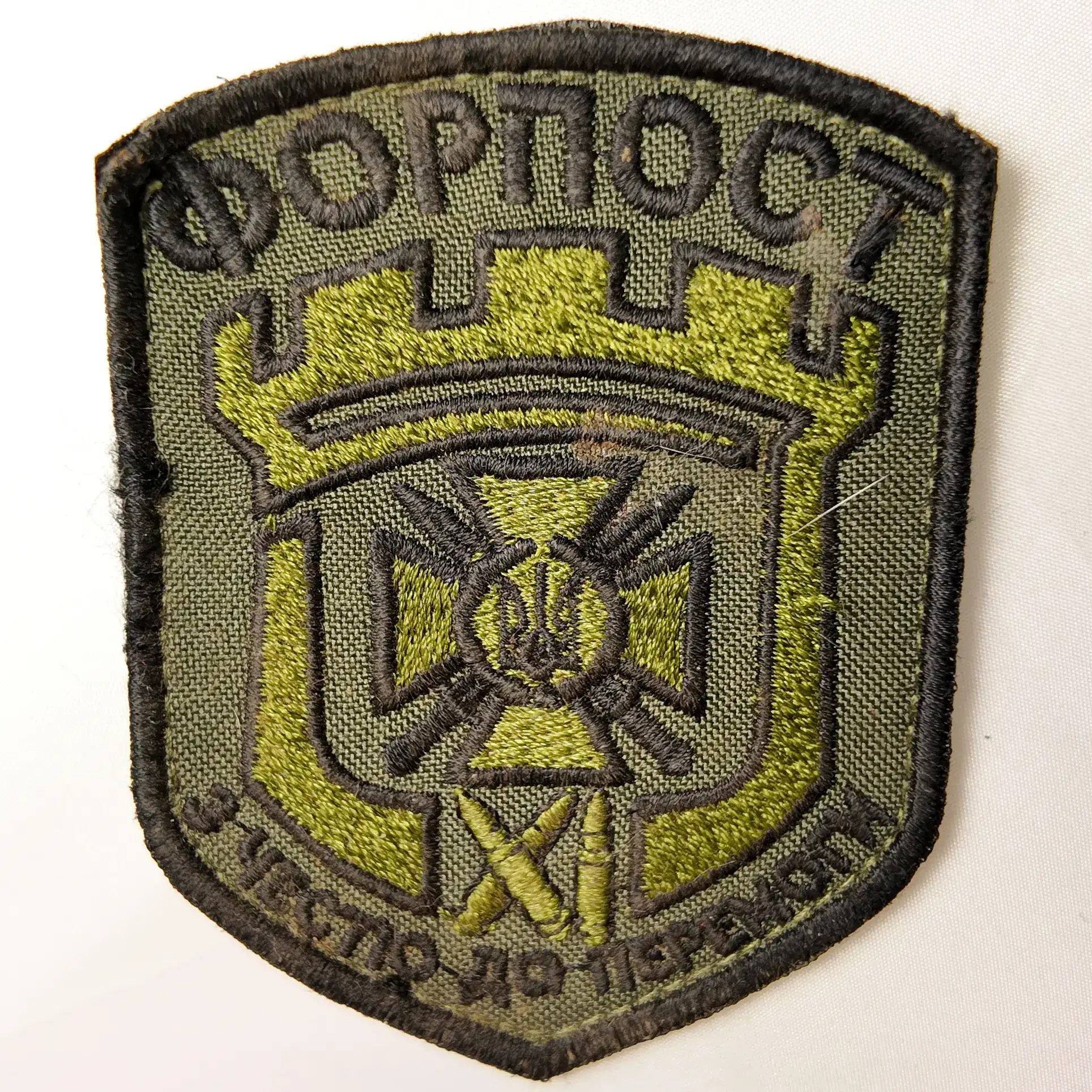 This embroidered chevron measures 6,5×8,5 cm and originates from the 93rd Separate Mechanized Brigade “Холодний Яр” of the Armed Forces of Ukraine. The design includes the fortress outline with the inscription “Форпост,” a cross with the Ukrainian trident, and crossed rifles at the base.