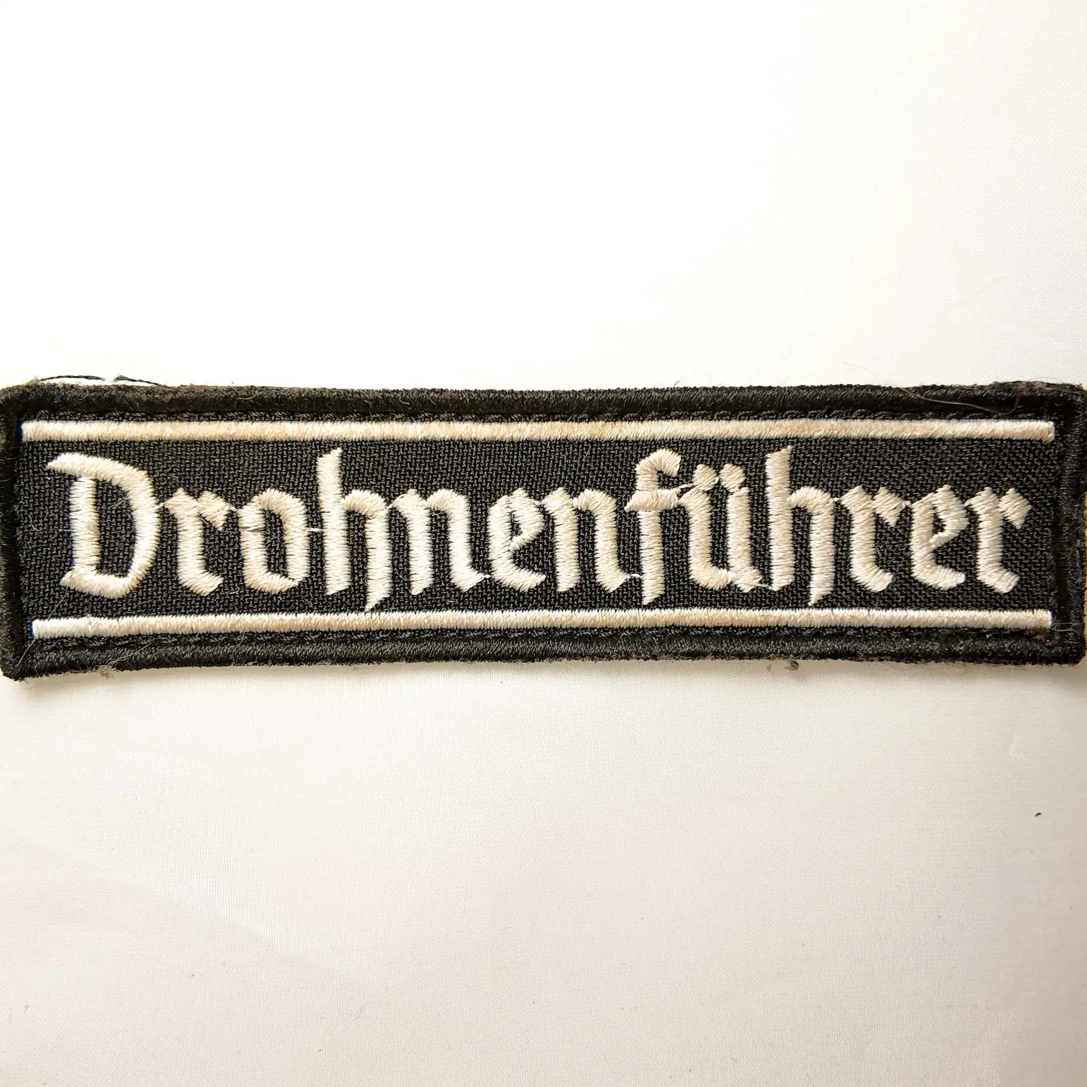 The Ukrainian FPV Drone Operator Patch Combat Worn 12×3cm is an embroidered insignia with the German-style Gothic lettering “Drohnenführer,” meaning “drone operator.” Measuring 12×3 cm, it was worn by FPV drone specialists in Ukrainian units, who played a crucial role in modern frontline operations.
