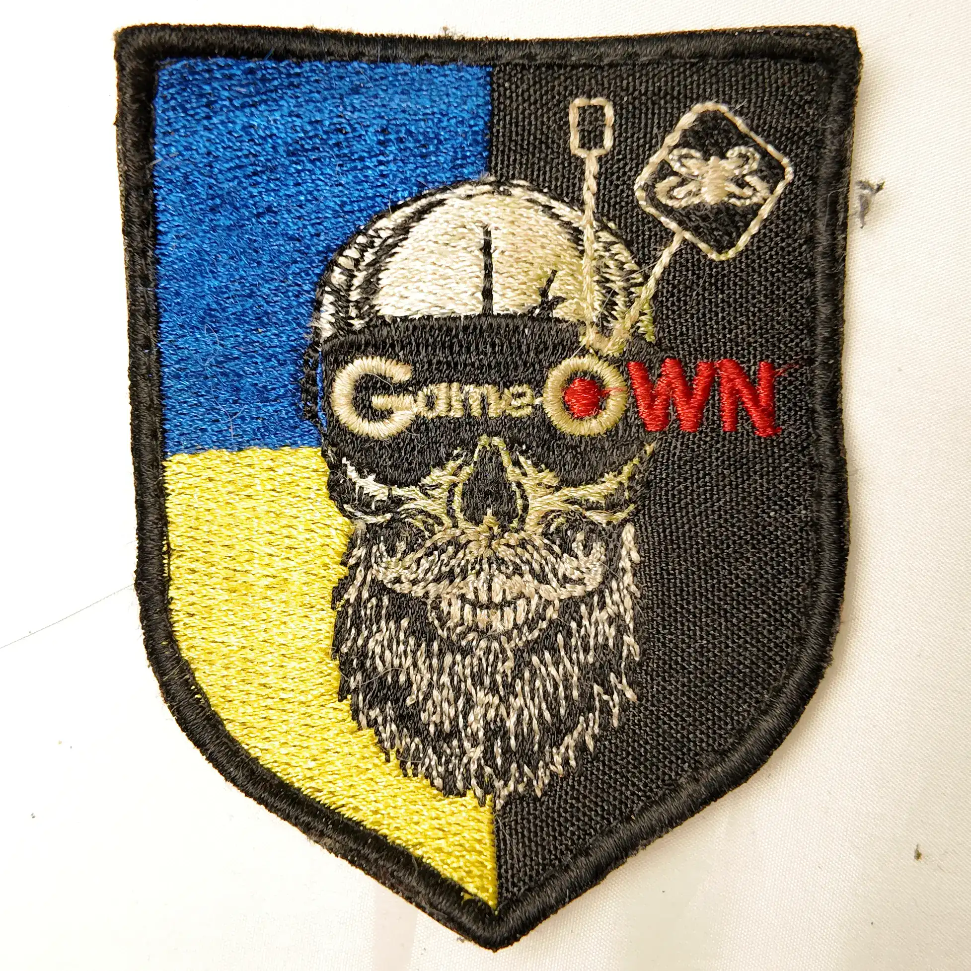 This embroidered patch represents Ukrainian FPV drone units and measures 8×6,5 cm. The design features a skull in drone goggles with the “Game OWN” inscription, set against the Ukrainian flag background. It comes directly from field use and retains visible wear, confirming its authentic origin.