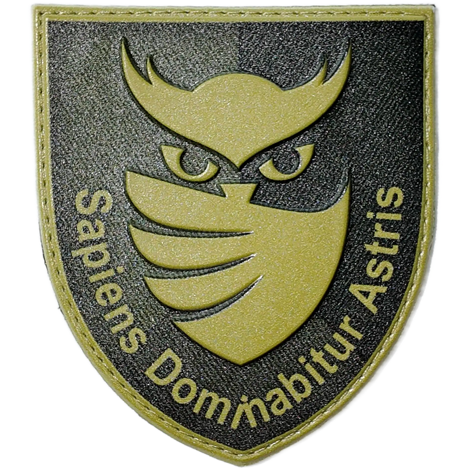 The design features an owl, a traditional symbol of wisdom and vigilance, along with the Latin motto “Sapiens Dominabitur Astris” — “The Wise Will Rule the Stars.” This emblem is associated with military intelligence and specialized reconnaissance units.