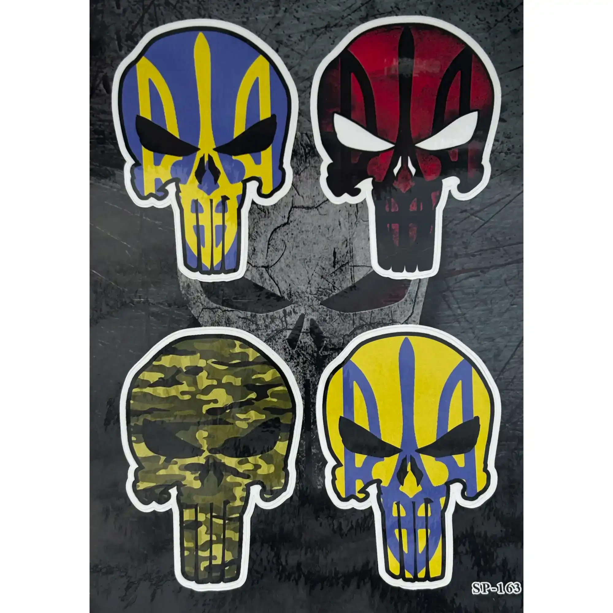 4 unique skull stickers: Blue-yellow skull, camo skull, red skull, and tactical Ukraine skull.