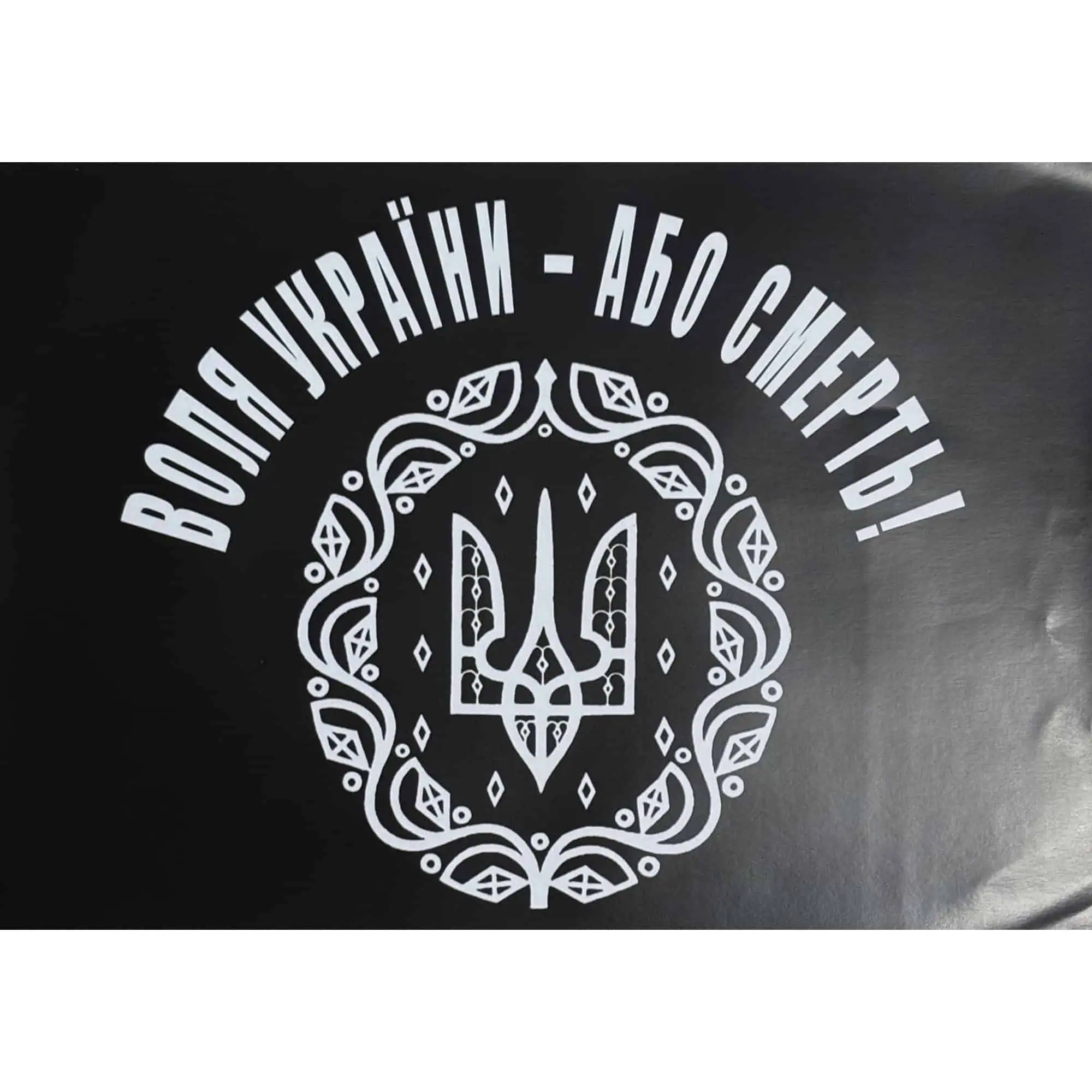 This poster features the phrase “Воля України – або смерть!” (Freedom of Ukraine – or death!) written in bold white letters on a black background. The central design includes the Ukrainian trident art (tryzub)