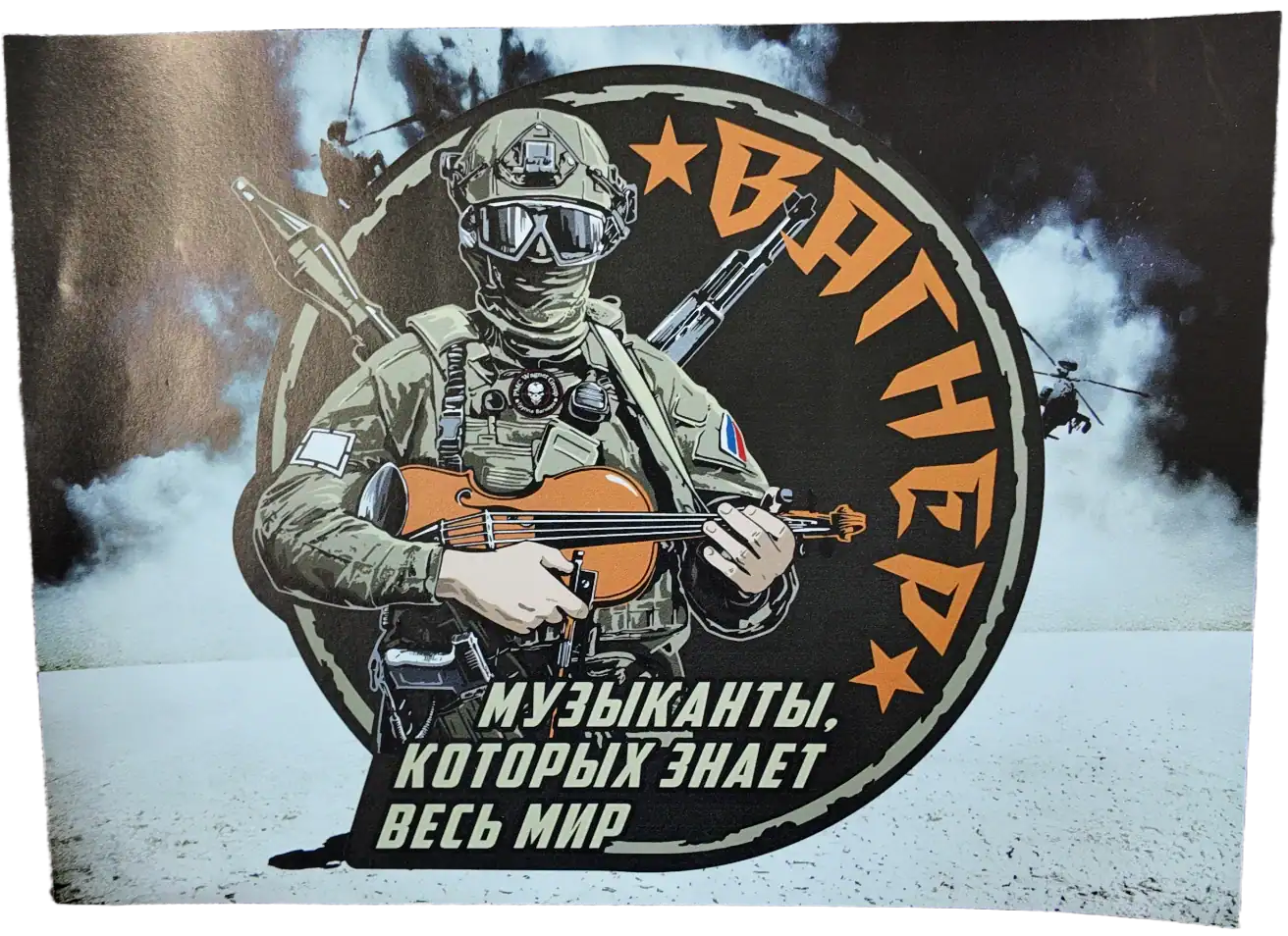 This Wagner Musicians Poster blends militarism with metaphor in a dramatic, visually striking design. Depicting a Wagner fighter holding a violin — a symbolic nod to the group’s moniker “Orchestra” — it features the slogan: