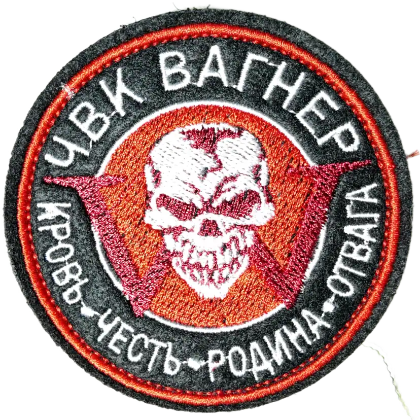 This circular morale patch features the emblem of the Wagner Group — a private military company heavily active in the Ukraine war. The design includes a white skull, red background with a bold “W”, and the Cyrillic slogan: