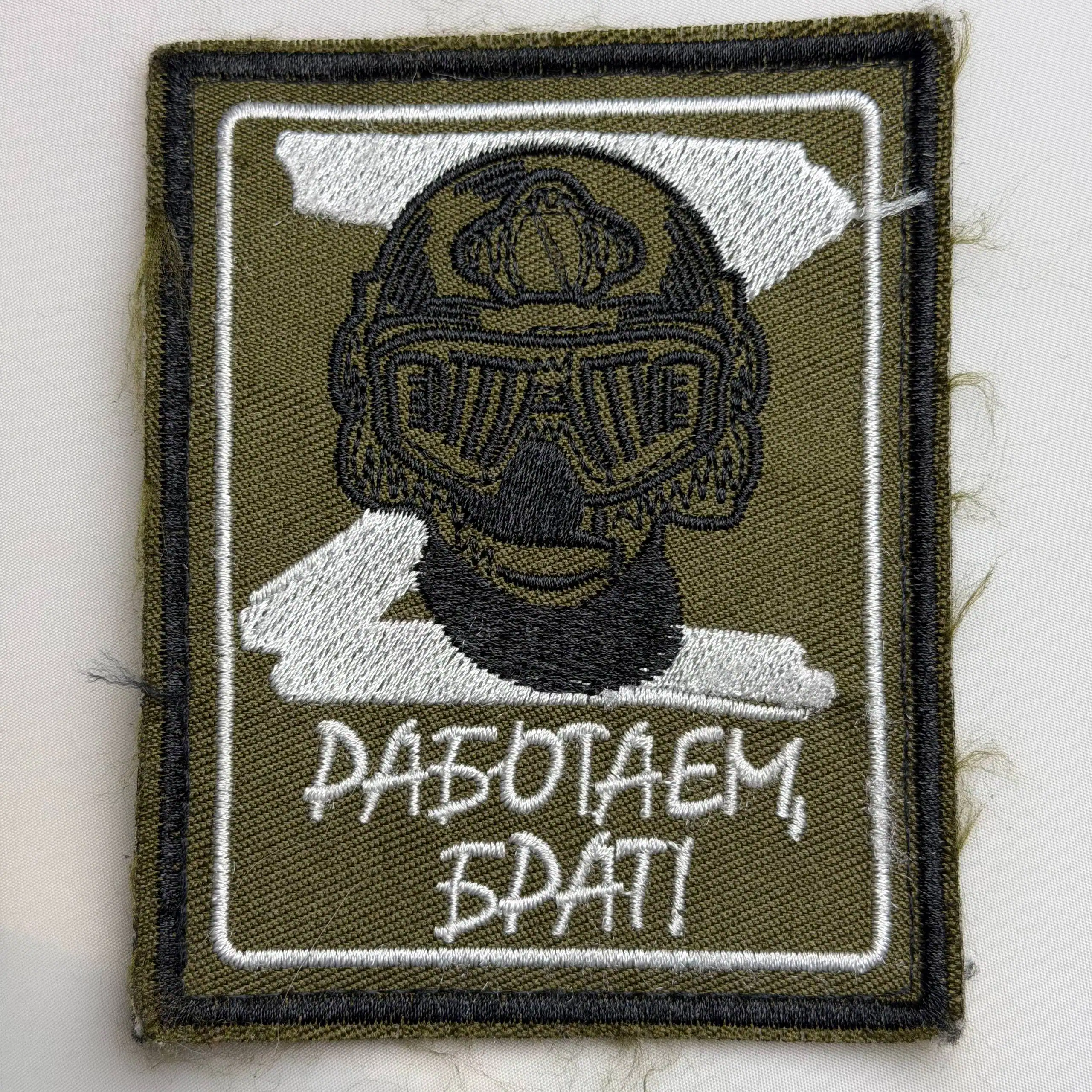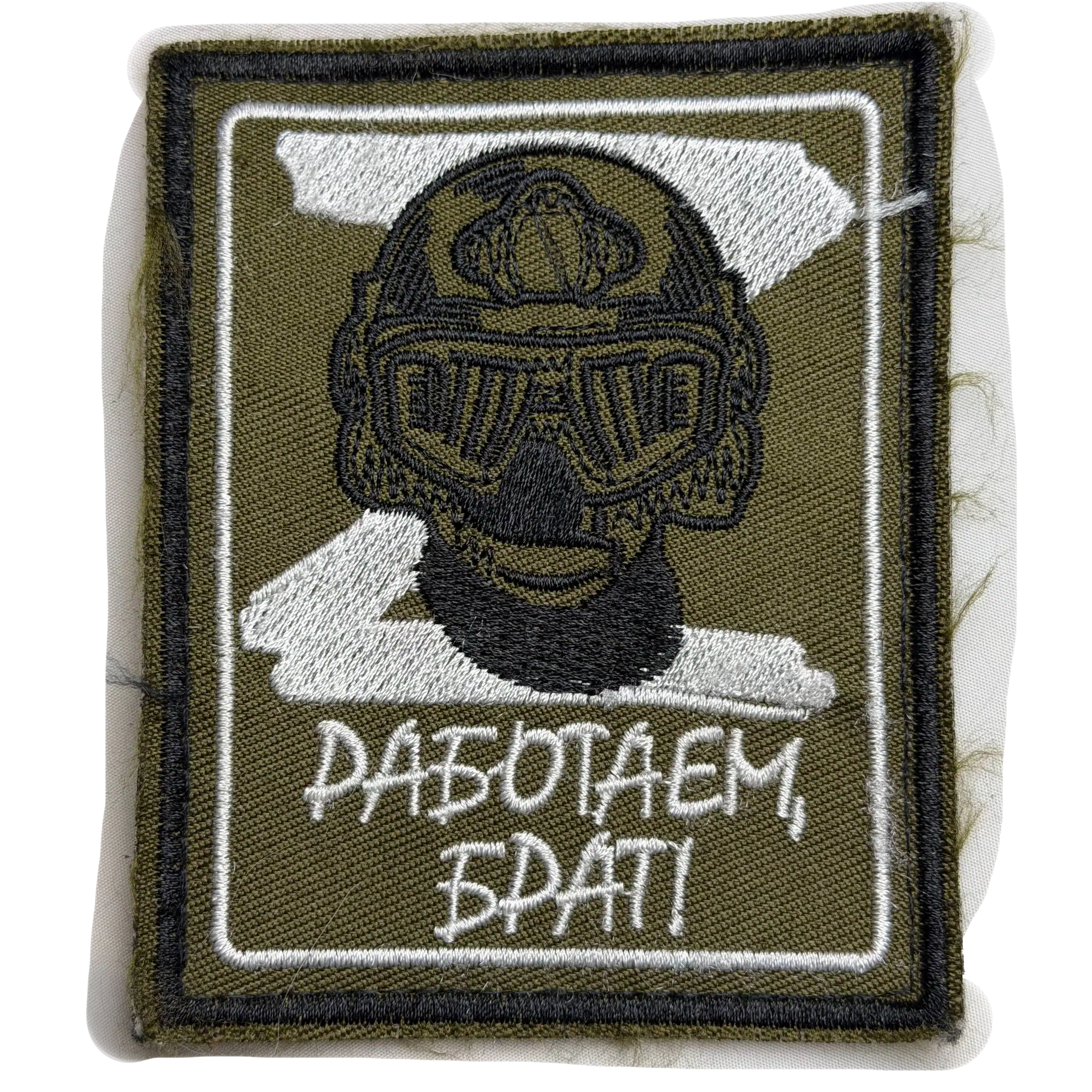 The central image depicts a stylized soldier wearing protective headgear and tactical goggles, rendered in dark thread tones against a contrasting background. White angular elements resembling paint marks or graphic overlays are embroidered behind the figure, forming part of the visual composition. Below the image, Cyrillic text reads “РАБОТАЕМ, БРАТ”, which translates into English as “We are working, brother”. The phrase is commonly used as an informal expression of coordination or solidarity rather than an official slogan.